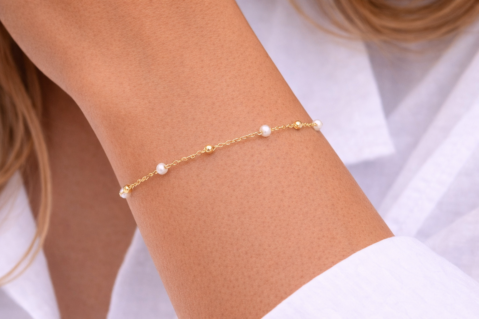 Bracelet Gi&Lo boules blanches – 17-18 cm , Or Jaune 18K